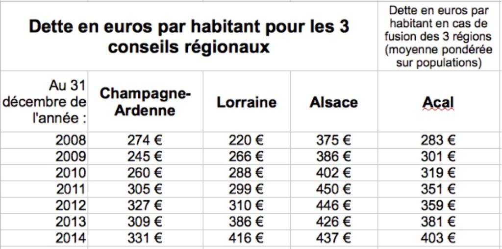Car, dans ces conditions, répétons-le, c’est la Champagne-Ardenne qui va trinquer : sur la base des relevés au 31 décembre 2014, du simple fait de la fusion, son endettement par habitant ferait un bond de 331 à 403 euros, soit une augmentation subite, et subie, de près de 22%. A vous dégoûter d’avoir été trop sages : les Champardennais vont bientôt se faire accuser d’avoir vécu au-dessus de leurs moyens par tous les experts en économie, en dette publique et… en austérité !