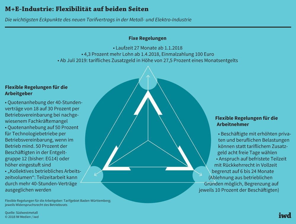 L’accord pilote entre le syndicat de branche IG Metall et le patronat ouvre la voie au concept, inédit, de flexibilité du temps de travail choisi par les salariés. Il ne revient certes pas à réduire la durée légale du temps de travail à 28 heures mais envoie un symbole fort dans le cadre de ce débat.