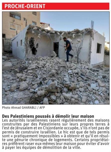 Les informations dans les médias nationaux ou régionaux sur le sujet des destructions de maisons sont rares, et remercions donc les quotidiens alsaciens pour le bref article avec photo publié dans l’Alsace du 31 août (rubrique « 24 heures en bref ») et dans celle des DNA, (rubrique« France Monde » – Proche Orient ») sur la destruction de sa propre maison par un Palestinien, le commentaire du journaliste précisant que les autorités israéliennes rasent régulièrement des maisons construites par des Palestiniens pour raison de défaut de permis de construire….qu’ils n’accordent pratiquement jamais par ailleurs.