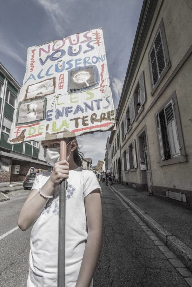 Au programme de la marche, une première halte devant le fast-food du stade nautique, avec des inscriptions au sol rappelant qu’il fallait 16 800 litres d’eau et 38 kg de CO2 pour produire un kilo de bœuf. Suivie d’une deuxième à la maison des Berges, le long de l’Ill pour reprendre en chœur la chanson du groupe Tryo, « L’Hymne de nos campagnes ». Enfin une troisième action sous la forme d’un « die-in » dans laquelle les participants ont simulé la mort, en se couchant devant les entrées de la mairie rue Pierre et Marie-Curie. Trois questions portaient sur la préservation de l’environnement et de la biodiversité, et sur la nécessité de limiter le réchauffement climatique.