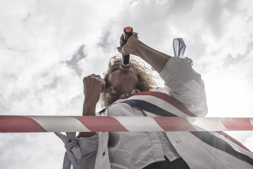 Reçue en point d’orgue de la manifestation, la députée du Bas-Rhin, en tournée de soutien depuis quelques temps déjà, et véritable porte-voix de nombreux manifestants qui se reconnaissent en elle, réussit à tenir le micro plus de 35 minutes, sans notes, s’adressant à la foule derrière le rempart d’un ruban de chantier semblant valoir cordon « sanitaire ».