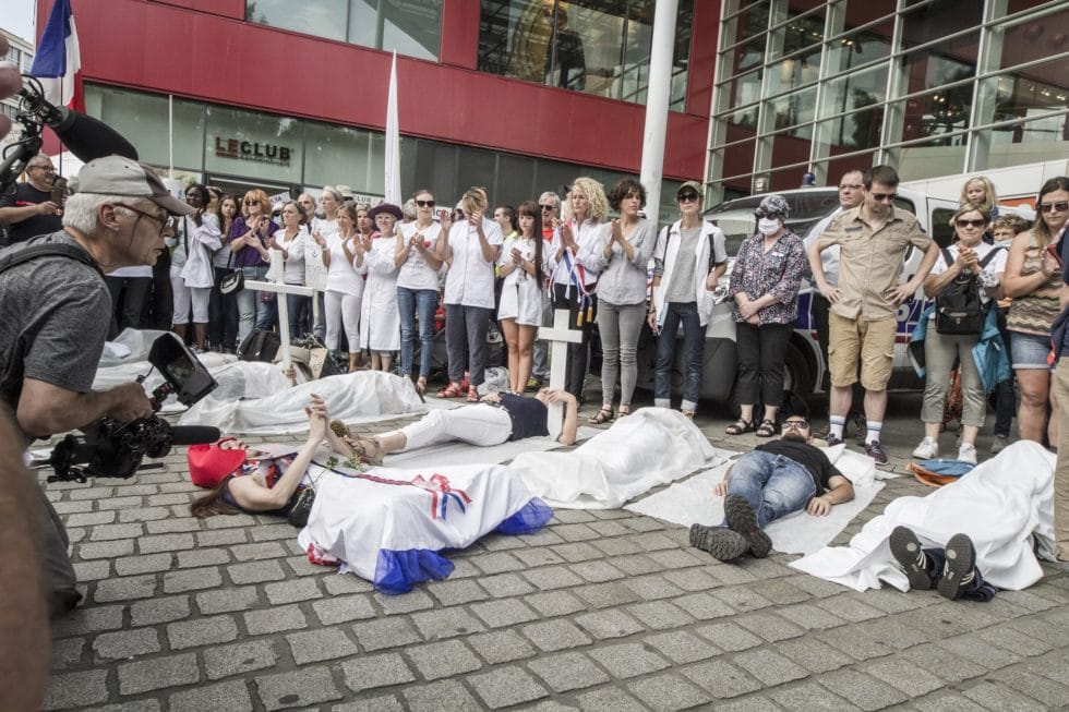 Quant à la manifestation, elle connut son point d’orgue, consistant en un jeté de blouses blanches devant la Porte jeune, et une simulation mortifère du sort fait aux soignants.