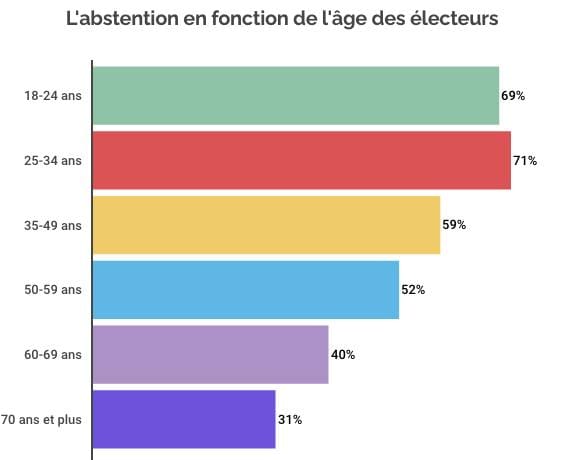 On observe clairement ci-dessous qu’à peine 30% des jeunes de 18 à 34 ans aura voté au premier tour, contre 70% des plus de 70 ans…