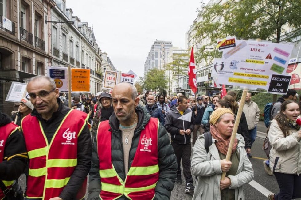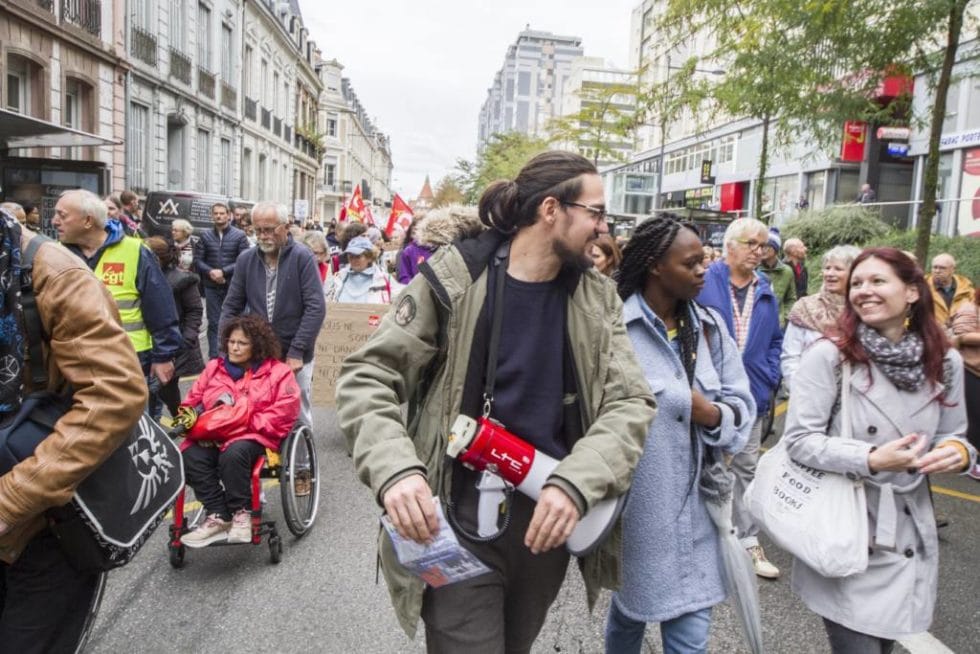 Tout comme partout ailleurs sur le territoire, où deux cents manifestations étaient prévues, plusieurs centaines de personnes défilaient hier dans les rues de Mulhouse, après s’être retrouvées sur la Place de la bourse à 14 heures, répondant à un appel national syndical, politique et associatif.