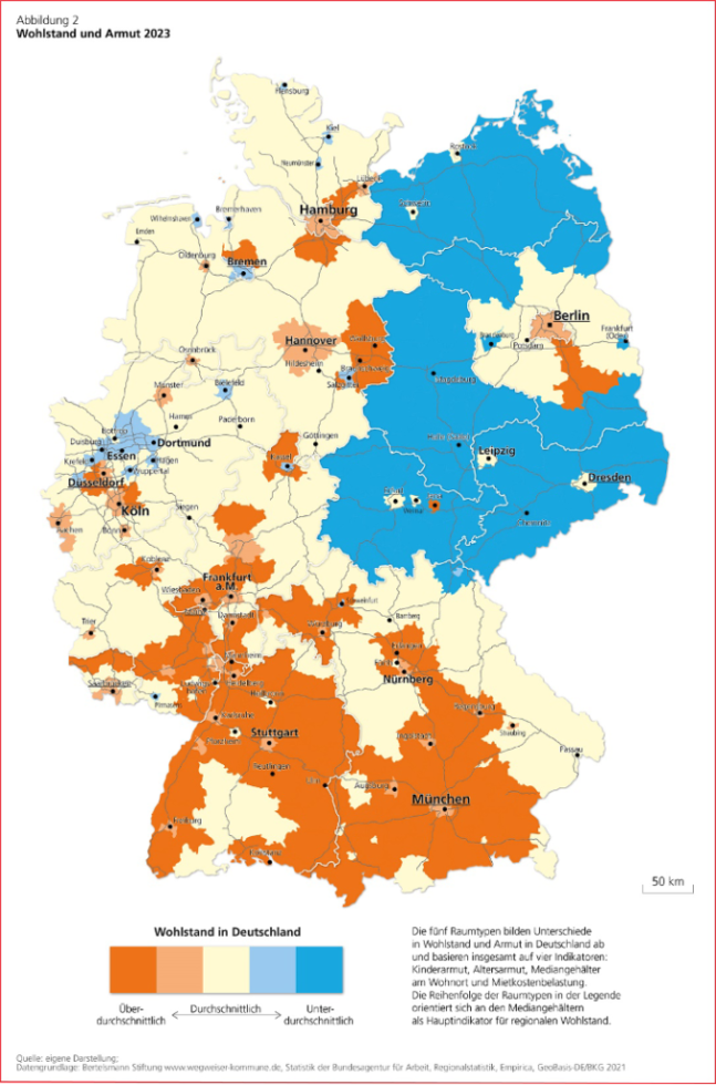 On peut également voir sur la carte ci-dessous, qu’il y a des inégalités flagrantes aussi dans les territoires. On constate que l’est du pays, mais aussi dans une moindre mesure l’ouest industriel sont les plus touchés par la pauvreté alors que les grands centres urbains et le sud le sont moins.