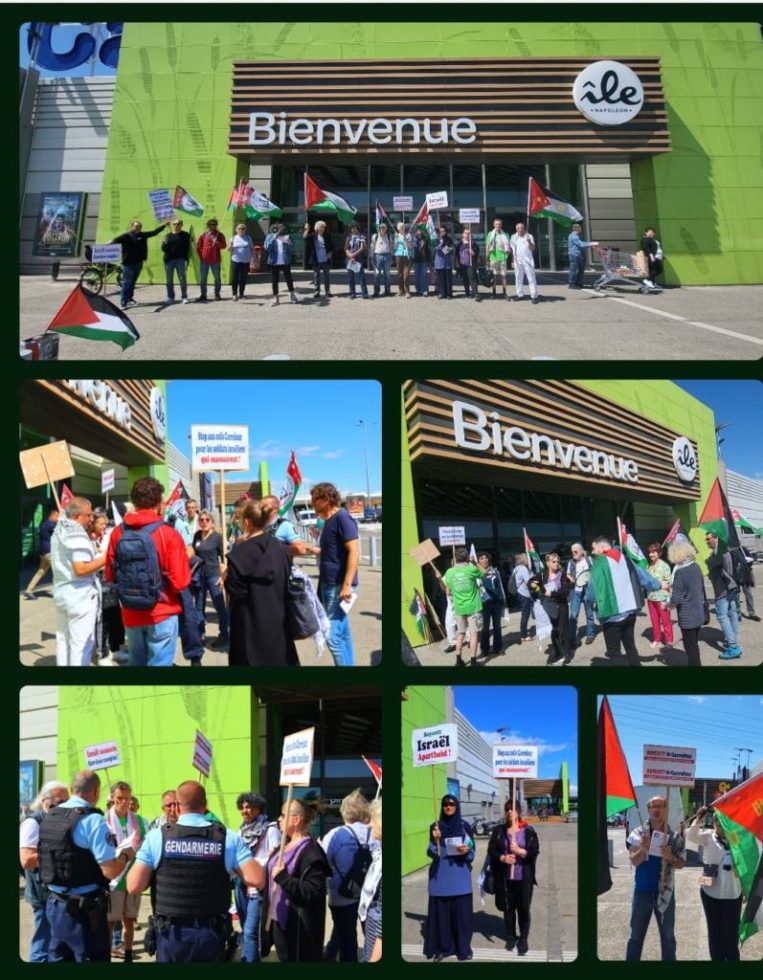 Ils y ont donc distribué des tracts à la clientèle de l’hypermarché, et pris la parole afin de rappeler que cette enseigne est complice de fait de la politiques israélienne, en développant ses activités dans les colonies israéliennes de Cisjordanie (9 implantations sont comptabilisées) et en distribuant des colis alimentaires aux soldats de l’armée israélienne qui opèrent à Gaza.