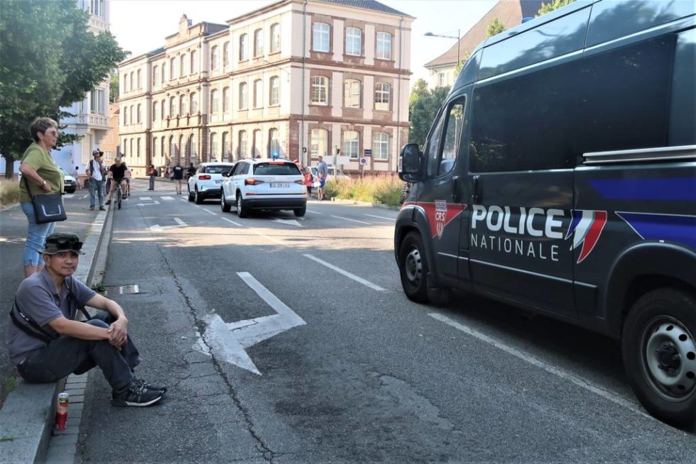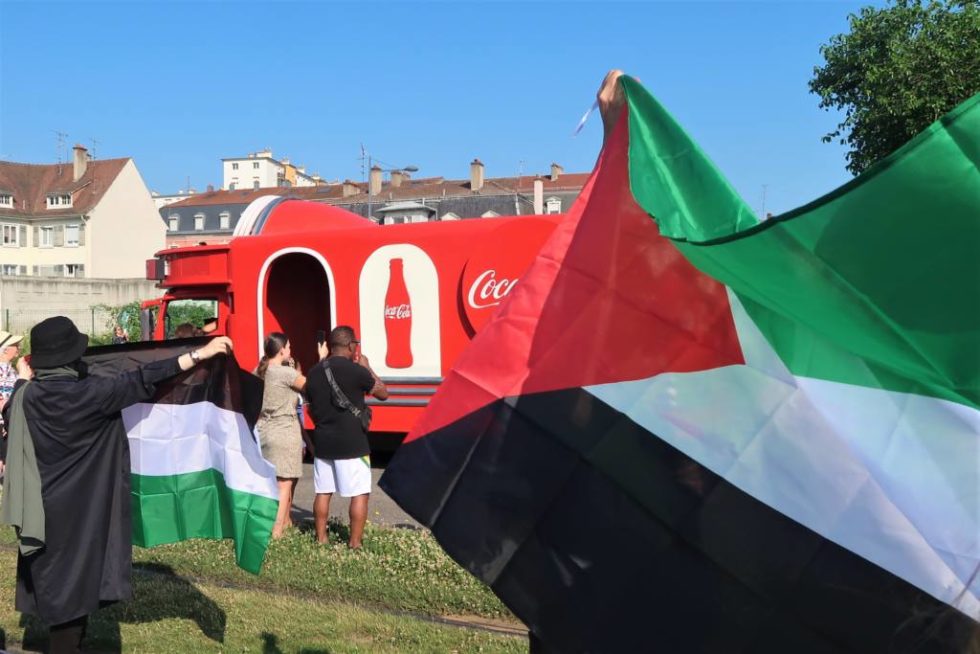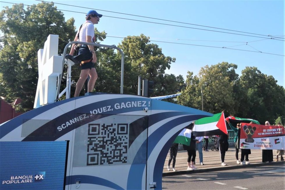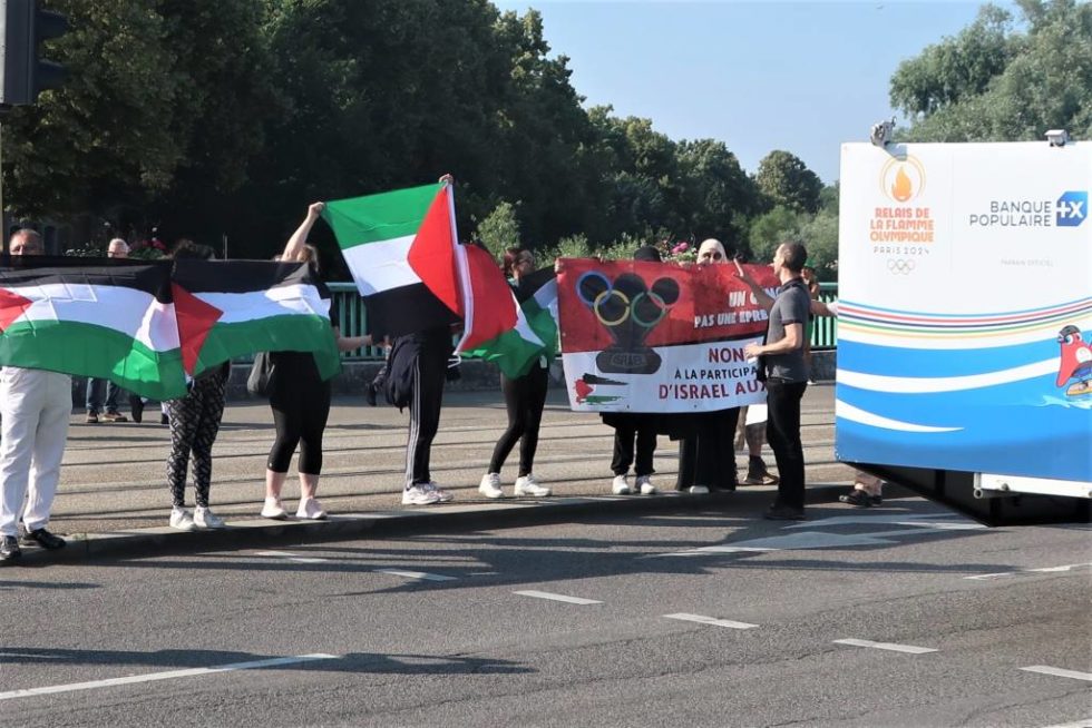 En effet, des manifestants du groupe BDS ont pendant un temps très bref tenté de déployer une banderole au niveau du pont Stoessel, sur laquelle était écrit : « Le génocide n’est pas une épreuve olympique, non à la participation d’Israël aux jeux olympiques« .