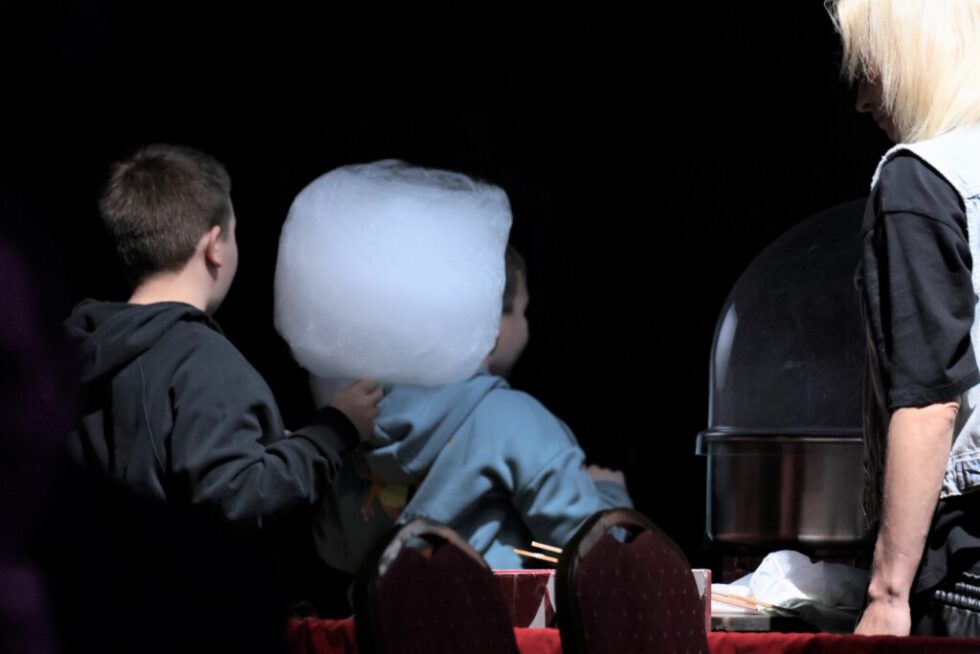 Ainsi avons-nous remarqué qu’un machiniste actionnant des interrupteurs la tête penchée de lassitude, est aussi un artiste présent sur la piste. Quand aux duettistes clowns, ils sont par ailleurs vendeurs de friandises, colifichets lumineux, confectionnent gaufres et crêpes aux enfants ivres d’émotions, la tête dans les nuages de barbe à papa…