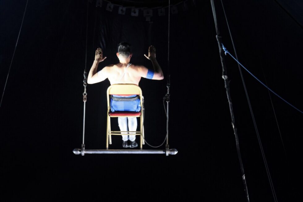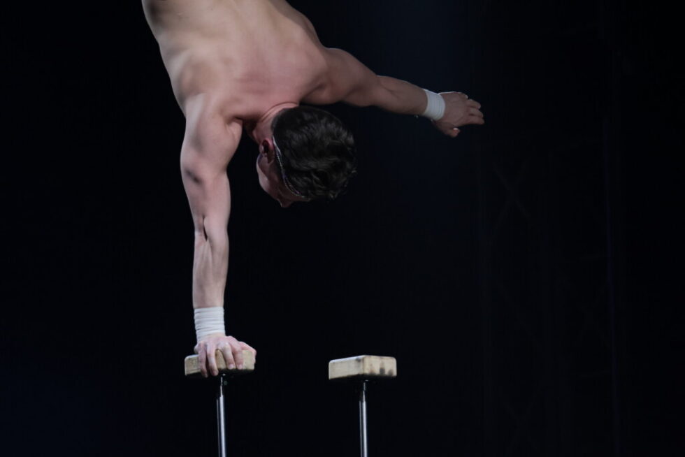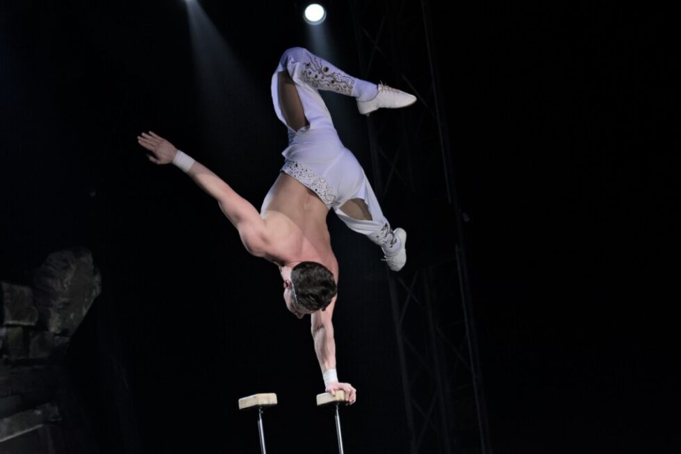 Ou encore un mono-cycliste funambule, un équilibriste-voltigeur hors-pair, un trapéziste qui se pique d’installer une chaise sur sa balançoire, un trio de danseurs acrobates grimés en cosaques farouches, des duettistes dansant dans le noir sur un rythme techno vêtus de costumes lumineux projetant des faisceaux lasers…
