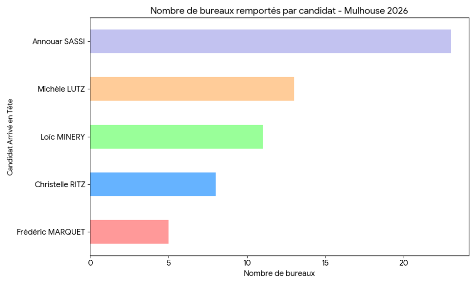 Arrivé en 4° position, Annouar Sassi est pourtant celui qui termine premier dans 24 bureaux sur 60, Michèle Lutz dans 13, Loïc Minery dans 11, Christelle Ritz dans 8, Frédéric Marquet dans 5, et Lara Million dans 1, illustrant une fragmentation cartographique extrême.