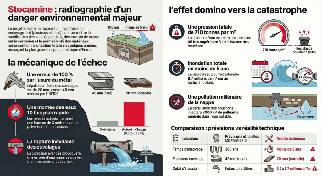 Résultat : une rupture partielle du cuvelage – attendue « prochainement » selon les aveux récents de l’INERIS – propulserait un débit d’ennoiement entre 3,5 et 8,7 millions de m³ par an, noyant la mine en 3 à 6 ans au lieu de trois siècles !