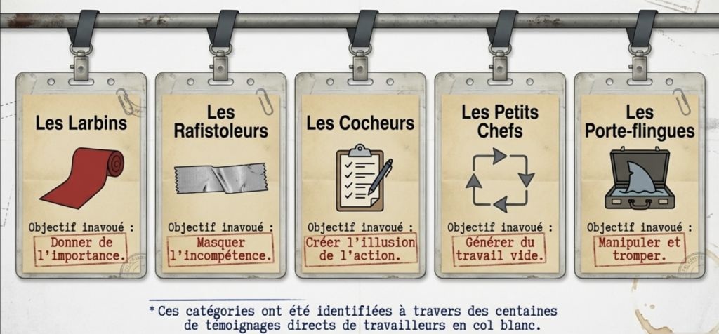 - Les petits chefs : qui créent des tâches inutiles pour les autres ou se contentent de superviser des gens qui n’en ont pas besoin.