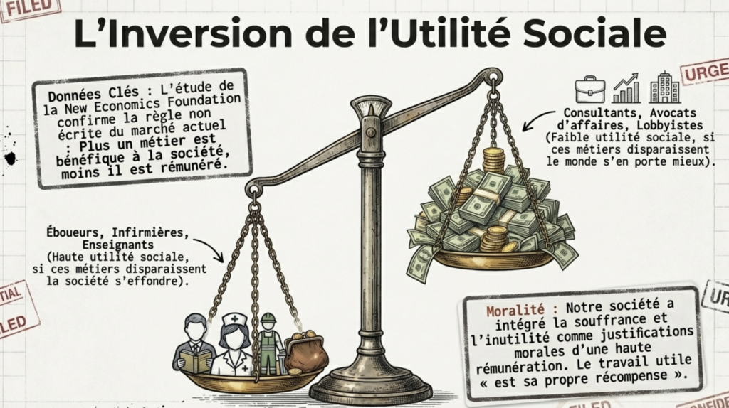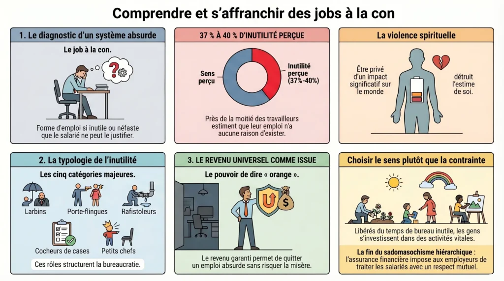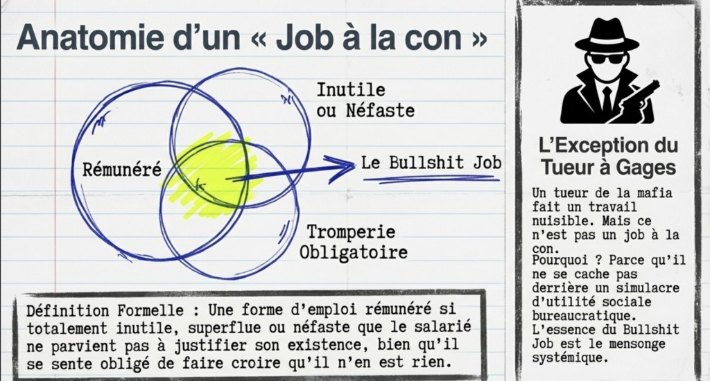 Le point de départ de cette réflexion est l’intuition de David Graeber, publiée en 2013 dans la revue semestrielle « auto-éditée et auto-distribuée » Strike, selon laquelle notre société regorge d’emplois dont l’utilité réelle est nulle.