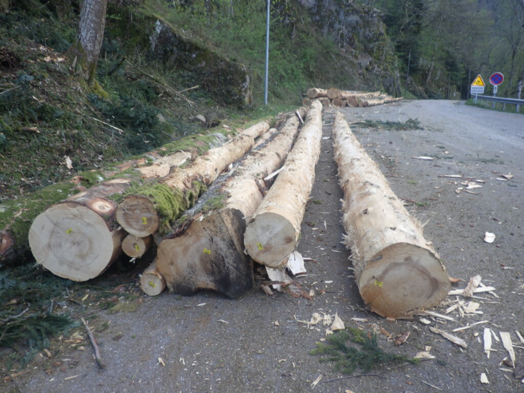 Près de 90% des grumes alignées le long de la route sont du bois parfaitement sain. Des marques d’acheteurs industriels — SIAT, la méga scierie d’Urmatt, et BEA, entreprise forestière de Cernay — figurent sur les billons. Le bois de la forêt publique communale part directement alimenter les profits d’acteurs privés, pendant que Sewen se félicite d’avoir été « aidée » par le Tour de France.