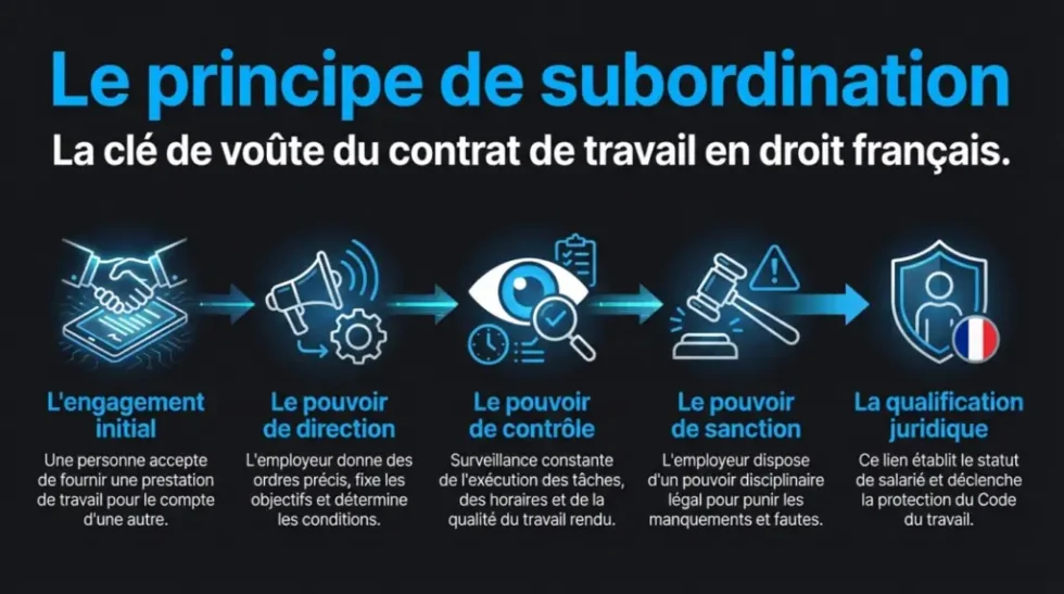 Le « volontariat » est illusoire, car la nature même du contrat de travail rend impossible un principe d’égalité ou de consentement non vicié : l’employeur seul dispose, contrôle et sanctionne. L’employé exécute. Telle est la loi d’airain du rapport social au travail, matérialisé en particulier dans le principe de subordination, qui institue le rapport salarial lui-même. Comme on le voit dans le schéma ci-dessous :